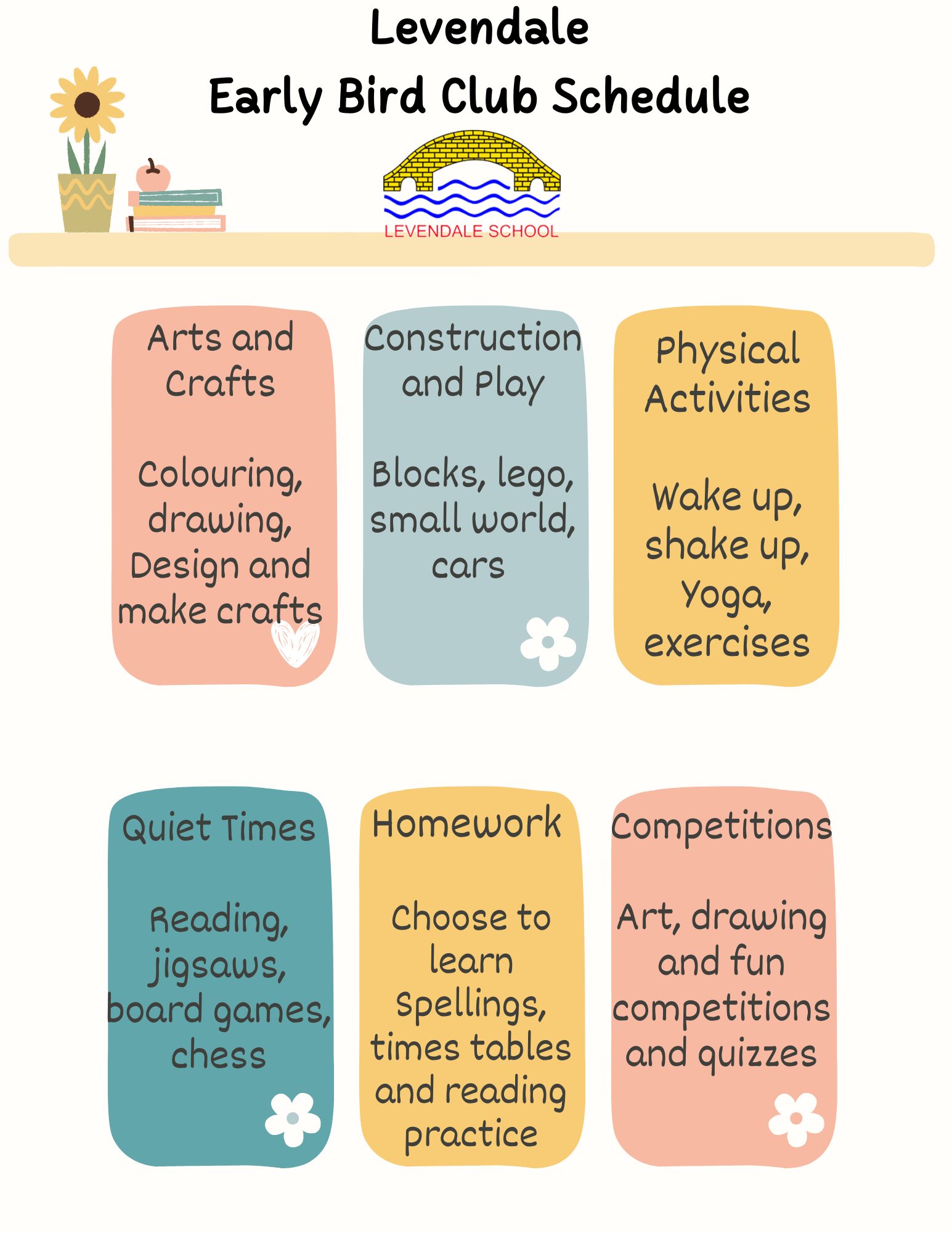 Breakfast club is called ‘Early Bird Club’ and After-school club is ‘Stay and Play.’